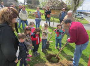 Narón, 28 de abril de 2016. Nenos e nenas da Escola Rural de Sedes, acompañados por familiares e por representantes da Asociación de Veciños “Rosa dos Ventos”, da mesma parroquia, participaron nun novo acto con motivo da conmemoración do 95 aniversario das citadas instalacións educativas, que se celebra este ano. A iniciativa, que consistiu no descubrimento dunha placa e na plantación de trece árbores autóctonas nas inmediacións do recinto feiral do Trece, contou tamén coa participación do alcalde, José Manuel Blanco; da concelleira de Cultura, Marián Ferreiro e do edil de Urbanismo, Manuel Ramos.