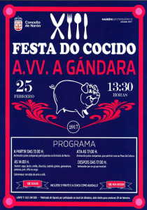 Narón, 17 de febreiro de 2017. O Concello de Narón e a Asociación de Veciños da Gándara organizan unha nova edición, a décimo terceira, da Festa do Cocido, que terá lugar o vindeiro 25 de febreiro. A programación inclúe unha gran variedade de actos, que comezarán ás 13.30 horas cunha animación a cargo de comparsas participantes no Entroido de Narón. O xantar dará comezo ás 14.00 horas e as persoas interesadas en adquirir os tickets deberán facelo ata o vindeiro luns, día 20 de febreiro, incluído. O prezo é de 15 euros para os socios da entidade e de 18 para o resto, cantidades coas que poderán degustar un menú a base de sopa, lacón, orella, chourizo, costela, grelos, garavanzos, patacas, pan, viño ou auga, torradas de anís e café, incluíndo o prato e a cunca como agasallos, tal e como indicaron desde a AVV. A comida terá lugar, como cada ano, no Pavillón da Mocidade, fronte ao local social da Gándara.