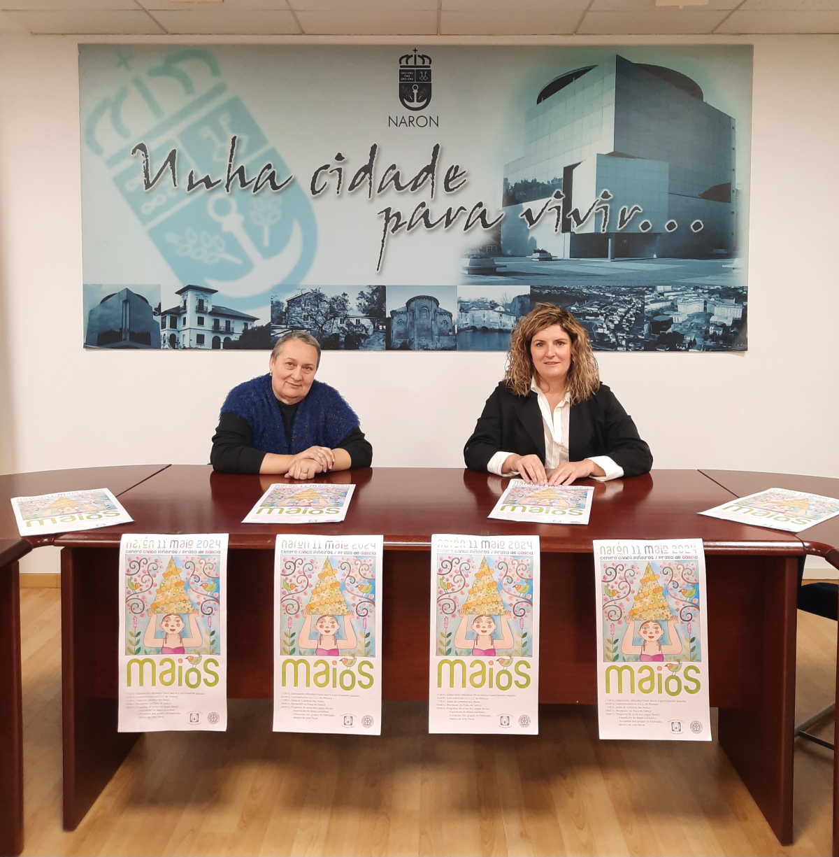 Narón, 2 de maio de 2024. A alcaldesa de Narón e presidenta do Padroado da Cultura, Marián Ferreiro, e Maribel Mouriz, vicepresidenta da Sociedade Cultural Areosa, de Piñeiros, presentaron a programación da festividade dos Maios, que terá lugar o vindeiro sábado, día 11. A cidade festexará un ano máis con esta celebración, cargada de flores e música, a chegada da primavera.
