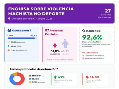 O Concello de Narón vén de facer públicos os resultados da enquisa sobre violencia machista no deporte incluída na campaña “Narón adestra en Igualdade” e realizada durante o mes de xaneiro de 2026 entre clubs e escolas deportivas do municipio.