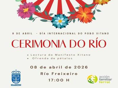 O Concello de Narón participa este mércores, 8 de abril, na Cerimonia do Río organizada por Acción Familiar (AFA) Ferrol con motivo do Día Internacional do Pobo Xitano. O acto terá lugar ás 17:00 no Río Freixeiro, preto do parque, e inclúe a lectura dun manifesto e a ofrenda de pétalos.