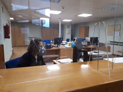 Narón, 29 de abril de 2020. A maiores das medidas de urxencia que se adoptaron para a protección do persoal que traballa nos servizos esenciais de xeito presencial, en Narón comezáronse a instalar mamparas de protección fronte á Covid-19 en varias dependencias municipais nas que os funcionarios e funcionarias atenden á veciñanza ou retomarán a súa actividade a medida que se avance no proceso de desescalada das restricións impostas tras decretarse o estado de alarma e se vaian reabrindo os edificios municipais. A alcaldesa da cidade, Marián Ferreiro, asegurou que “este tipo de medidas de protección colectiva súmase á dos EPIs e outros materiais (luvas, xeles, mascarillas…) que xa está implementada e responde a unha necesidade para ofrecer ás traballadoras e traballadores que están en postos de atención directa á veciñanza todas as garantías sanitarias para poder realizar o seu labor naqueles servizos que non se poidan prestar a distancia”.