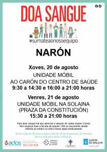 Narón, 18 de agosto de 2020. Unha unidade móbil da Axencia de Doazón de Órganos e Sangue (ADOS) desprazarase o xoves e o venres desta semana á cidade. O vehículo localizarase o xoves día 20 nas inmediacións do centro de saúde do Alto, entre as 9.30 e as 14.30 e tamén pola tarde, de 16.00 a 21.00 e na xornada do venres estará nas proximidades da Praza da Constitución, na Solaina, entre as 15.30 e as 21.00 horas.