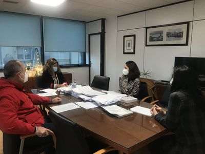 Narón, 2 de decembro de 2020. A alcaldesa, Marián Ferreiro, e o edil de Promoción Económica, David Pita, reuníronse esta mañá no Concello con dúas representantes da Asociación de Comerciantes de Narón para continuar analizando a situación do sector, co que o goberno local traballa nunha campaña xenérica e outra orientada á tempada de Nadal.