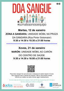 Narón, 5 de xaneiro de 2021. Unha das unidades móbiles da Axencia para a Doazón de Órganos e Sangue desprazarase este mes, concretamente o vindeiro martes 12 e o xoves 21, á cidade. O vehículo localizarase o martes nas inmediacións da Praza da Gándara, na rúa Pintor Soutomaior - entre as 9.30 e as 14.30 e dende as 15.30 ata as 21.00 horas. Na xornada do xoves 21 a unidade móbil estacionará nas inmediacións do centro de saúde do Alto, na rúa 25 de xullo, donde permanecerá de 9.30 a 14.30 e de 16.00 a 21.00 horas.