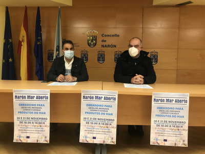 Narón, 12 de novembro de 2021. O edil de Promoción Económica, David Pita, e Javier Castro, integrante da asociación Terra Rendible, presentaron esta mañá no Concello un obradoiro para escoller, preparar, limpar e cociñar produtos do mar que se desenvolverá os días 20 e 21 deste mes no Centro Cívico Social do Val, de 10.00 a 14.00 horas. Pita explicou que se trata dunha proposta dirixida á cidadanía en xeral, e recordou que se enmarca no proxecto “Narón mar aberto”, financiado pola Unión Europea (Fondo Europeo Marítimo e da Pesca) e subvencionado a través do Grupo de Acción Local do sector pesqueiro Golfo Ártabro Norte (GALP). Conta ademais coa colaboración da Asociación de Veciños do Val, a Asociación Terra Rendible e a Confraría de Pescadores de Barallobre.