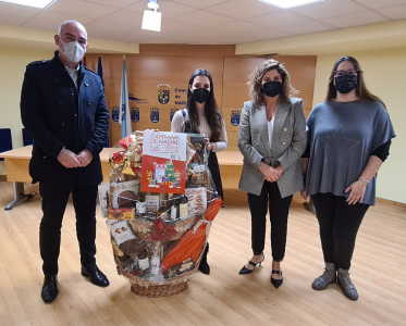 A alcaldesa, Marián Ferreiro, e o edil de Promoción Económica, David Pita, entregaron a cesta xunto con Vanesa Maseda, da Asociación de Comerciantes de Narón