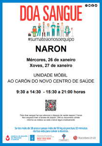 Narón, 24 de xaneiro de 2022. Unha unidade móbil da Axencia para a Doazón de Órganos e Sangue (ADOS) desprazarase este mércores e o xoves á cidade, concretamente ás inmediacións do novo centro de saúde do Alto do Castiñeiro. A unidade móbil permanecerá operativa entre as 9.30 a 14.30 e dende as 15.30 ata as 21.00 horas en ambas xornadas.
