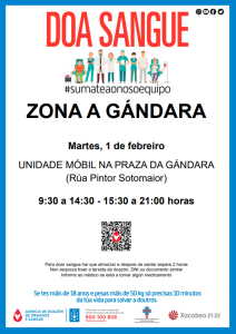 Narón, 31 de xaneiro de 2022. Unha unidade móbil da Axencia para a Doazón de Órganos e Sangue (ADOS) desprazarase mañá á cidade, estando operativa de 9.30 a 14.30 e dende as 15.30 ata as 21.00 horas na Praza da Gándara (rúa Pintor Sotomaior), segundo avanzaron dende ADOS.