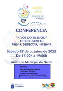 Narón, 27 de outubro de 2022. A Asociación Áurega, de familias de nenos e nenas con altas capacidades, talentos e inquedanzas intelectuais, programou unha conferencia para este sábado, día 29, ás 17.00 horas no Auditorio municipal de Narón sobre “A voz do silencio”, no que se abordará o tema do acoso escolar e a importancia de previr, detectar e intervir ante este tipo de situacións.