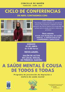 “Estas convocatorias concíbense como un espazo de encontro e reflexión sobre un tema de gran relevancia na nosa sociedade, como é o da saúde mental, un problema que padecen moitas persoas e que temos que visibilizar, de aí a organización deste programa municipal”, asegurou Ramos. O edil naronés destacou a excelente acollida que este ciclo de conferencias está tendo entre a cidadanía e animou ás veciñas e veciños a acudir ás mesmas.