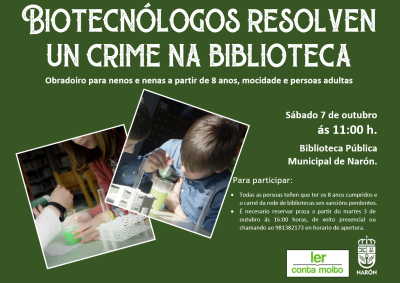 Narón, 2 de outubro de 2023. “Biotecnólogos resolven un crime na Biblioteca” é o título da actividade que se desenvolverá este sábado, día 7, nas instalacións da Biblioteca municipal. A edil responsable da área, Olga Ameneiro, explicou que se trata dunha proposta dirixida a menores a partir de 8 anos, mocidade e persoas adultas que poderán inscribirse a partir de mañá ás 16.00 horas nas citadas instalacións de xeito presencial ou chamando ao número de teléfono 981 382 173.