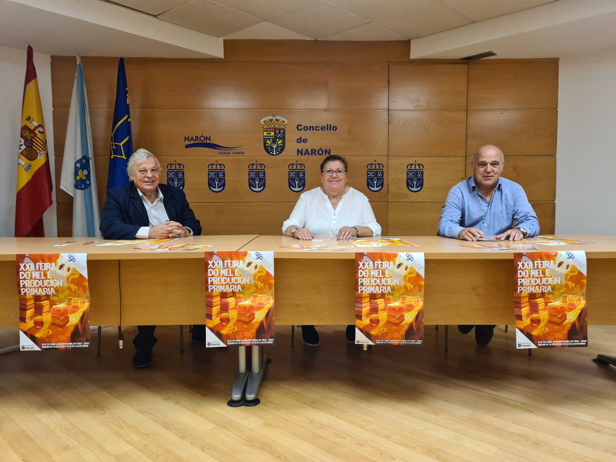 Narón, 5 de outubro de 2023. As instalacións do recinto feiral do Trece, en Sedes, acollerán o vindeiro día 15 a vixésimo segunda edición da Feira do mel e produción primaria. Unha convocatoria que presentaron esta maña no Concello os edís de Feiras, Mar Gómez, e Medio Ambiente, Manuel Ramos, acompañados polo delegado da Asociación Galega de Apicultura (AGA) en Ferrolterra, Rafael Díaz. A cita inclúe unha completa programación que se desenvolverá en horario de mañá e tarde, de 10.30 a 14.00 e dende as 16.00 ata as 20.00 horas e a entrada é de balde.