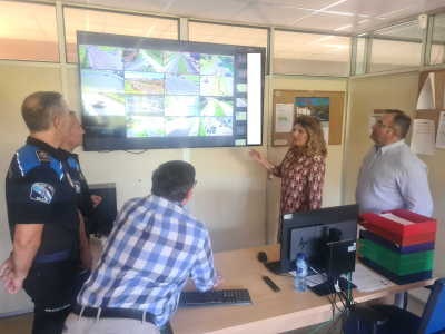 Narón, 6 de outubro de 2023. A alcaldesa da cidade, Marián Ferreiro, e o concelleiro de Seguridade Cidadá, José Oreona, desprazáronse onte ás instalacións da Policía Local de Narón nas Lagoas xunto co xefe do citado Corpo, Eduardo Pita, para supervisar a entrada en funcionamento das dezaséis cámaras de control e vixilancia do tráfico instaladas no polígono de Río do Pozo. A rexedora local explicou que se trata “de dispositivos fixos de captación e reproducción de imaxes para o control do tráfico, que se xestionan a través dunha central na que se almacenan os datos no soporte correspondente”.