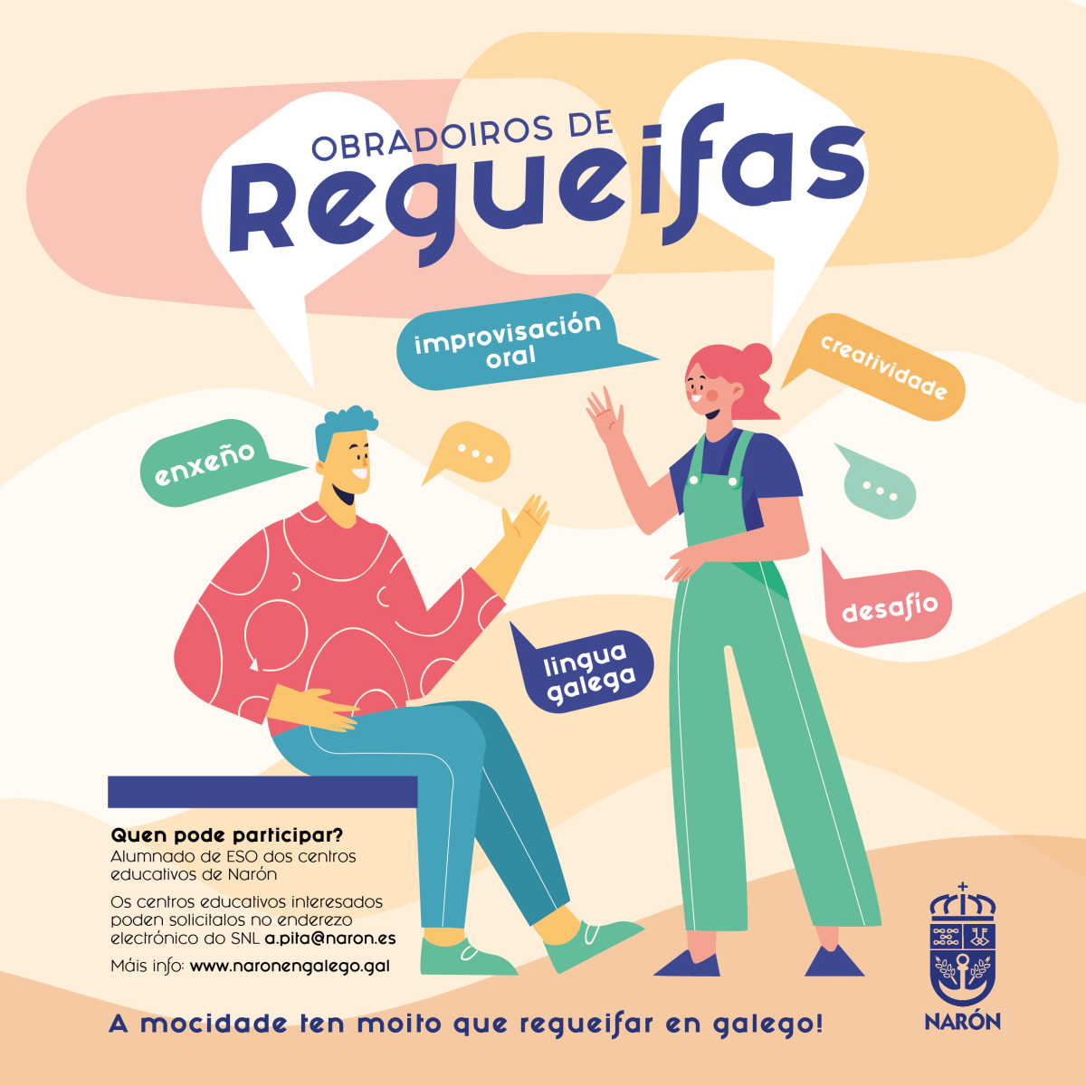 Dende o Concello ofrecéronse estes obradoiros a alumnado de ESO de centros educativos da cidade. A regueifeira Guadalupe Blanco será a encargada de impartilos, entre os meses de febreiro e abril, nos institutos das Telleiras e Terra de Trasancos, no CPI do Feal e no CPR Jorge Juan.
