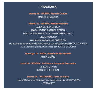 O Jazz de ría continuará o domingo 18 en Neda, o luns 19 en Cedeira e o martes 20 en Valdoviño. A programación ao completo pódese consultar a través das redes sociais do Concello de Narón e do propio festival.