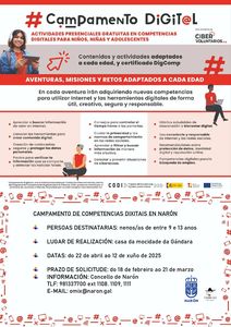 Narón, 18 de febreiro de 2025. O Concello de Narón ofrece á cidadanía o Campamento Dixital, unha iniciativa impulsada pola Fundación Cibervoluntarios, dentro do Programa de Competencias Dixitais para a Infancia, CODI, posto en marcha polo Ministerio de Juventud e Infancia, financiado pola Unión Europea-Next Generation. A concelleira de Ensino, Olga Ameneiro, indicou que se trata dunha proposta de balde dirixida a menores de 9 a 13 anos, que poden inscribirse ata o 21 de marzo –ás 13:30 horas- na Sede Electrónica do Concello de Narón, no Rexistro municipal ou en calquera dos lugares e rexistros establecidos nos artigos 14.1 e 16.4 da Lei 39/2015, do 1 de outubro, do Procedemento Administrativo Común das administracións públicas. Os participantes deben ser nenas e nenos empadroados no Concello de Narón ou escolarizados en centros de ensino da cidade.