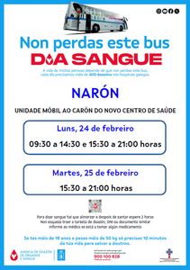 Narón, 19 de febreiro de 2024. Unha das unidades móbiles da Axencia de Doazón de Órganos e Sangue (ADOS) estará na cidade o vindeiro luns e martes, días 24 e 25 de febreiro. En ambos casos o vehículo estará operativo nas inmediacións do novo centro de saúde, o luns en horario de mañá e tarde, de 9:30 a 14:30 e de 15:30 a 21:00 e o martes pola tarde, de 15:30 a 21:00 horas.