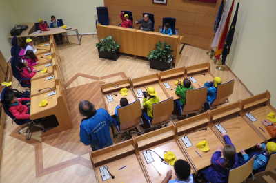 Narón, 28 de outubro de 2015. Uns cincuenta alumnos de terceiro e cuarto curso de Primaria do colexio de Piñeiros visitaron o Concello de Narón. Acompañados polos integrantes do equipo de Seguridade Vial de Narón, Pedro Caneiro e Simón Cabarcos, chegaron ao Consistorio en bicicleta e despois foron recibidos polo alcalde, José Manuel Blanco, e pola concelleira de Ensino, Mercedes Taibo, no salón de plenos.