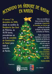 Narón, 4 de decembro de 2018. O acto oficial de acendido navideño do Concello de Narón terá lugar o vindeiro venres, día 7, nos xardíns da Residencia San José de Piñeiros. Así o anunciou a concelleira de Festas, Mar Gómez, que indicou que a convocatoria, á que convida a asistir á veciñanza, dará comezo ás 18.30 horas. A alcaldesa da cidade, Marián Ferreiro, será a encargada de accionar desde os xardíns da citada residencia o mecanismo que acenderá o botón que iluminará o abeto alí ubicado –dunha altura duns 25 metros- e, a continuación os diferentes elementos decorativos de Nadal que se instalaron nos últimos días en rúas e espazos públicos da cidade. O Concello organiza un ano máis o acto en colaboración coa Asociación de Veciños de Piñeiros, tal e como recordou a concelleira de Festas.