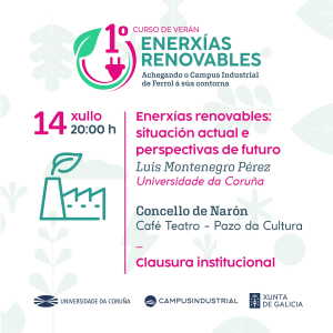 Así mesmo, na convocatoria, aberta ao público en xeral, estará presente o conferenciante e profesor da Universidade da Coruña Luis Montenegro, que será o encargado de impartir unha conferencia sobre “Enerxías renovables: situación actual e perspectivas de futuro”, a partir das 20.00 horas no Café Teatro do Pazo. A convocatoria está aberta ao público e pechará un ciclo iniciado o pasado 3 de xuño e que se desenvolveu nos concellos de Ferrol, Valdoviño, As Pontes, As Somozas e San Sadurniño, donde se convocaron ponencias con profesionais da UDC que abordaron o tema das enerxías renovables, co obxectivo tamén de achegar o campus industrial de Ferrol á súa contorna a través destas propostas.