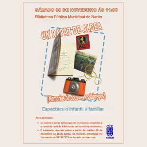 Narón, 25 de novembro de 2024. A Biblioteca abrirá mañá o prazo de inscrición no espectáculo “Un rapaz de aldea”, unha proposta de narración oral dirixida a público infantil e familiar. A concelleira responsable da área indicou que para poder asistir é preciso que os menores teñan os catro anos cumpridos e reservar praza, a partir de mañá ás 16:00 horas, de xeito presencial na Biblioteca ou chamando por teléfono ao número 981 382 173.