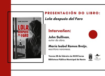 Narón, 26 de febreiro de 2025. A Biblioteca municipal acollerá este venres, día 28, o acto de presentación do libro “Lola, después del Faro”, a última novela do escritor gaditano John Sullivan. A concelleira responsable da área, Olga Ameneiro, informou que a convocatoria dará comezo ás 18:00 horas e contará coa participación da escritora naronesa Isabel Ramos Breijo, que acompañará ao autor nesta ocasión tan especial.