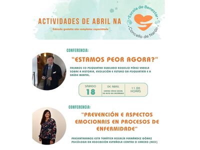 A ESCOLA DE BENESTAR DE NARÓN ABORDA EN ABRIL A SAÚDE MENTAL E O IMPACTO EMOCIONAL DA ENFERMIDADE EN DÚAS CONFERENCIAS ABERTAS Á CIDADANÍA