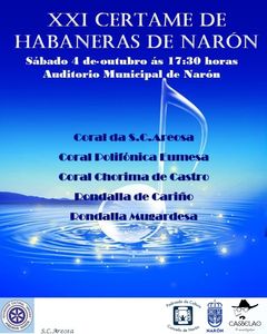 Narón, 1 de outubro de 2025. O Auditorio municipal, na Praza de Galicia, acollerá unha nova edición, a vixésimo primeira, do Certame de Habaneras organizado polo Padroado da Cultura e a Sociedade Cultural Areosa, de Piñeiros. A convocatoria dará comezo ás 17:30 horas.